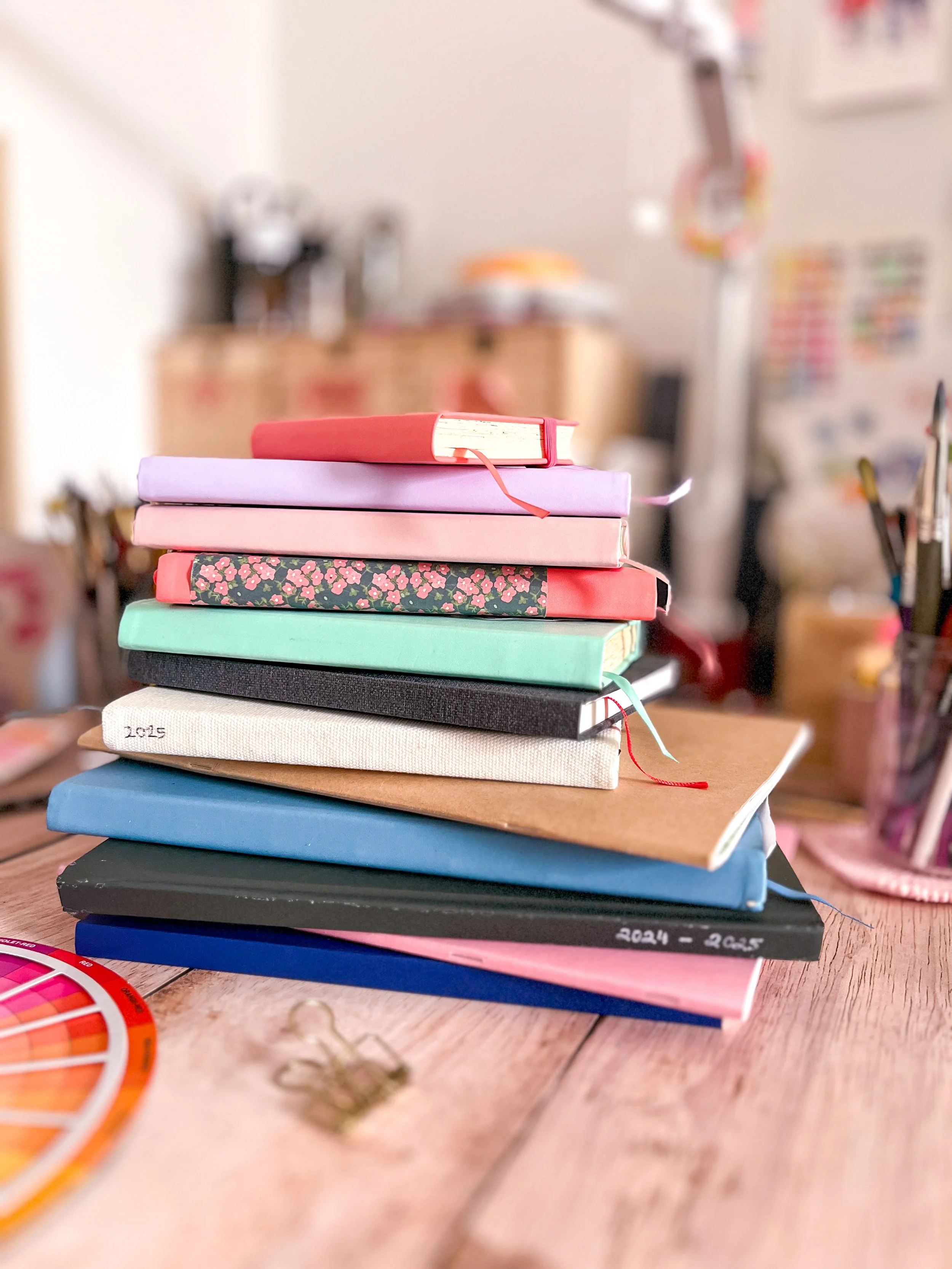 Les carnets sont de véritables terrains de jeu où laisser libre cours à la créativité. J’aime en varier les formats et types de papiers pour y créer avec tous les autres médiums qui me plaisent comme les feutres, les crayons de couleurs ou encore la gouache.